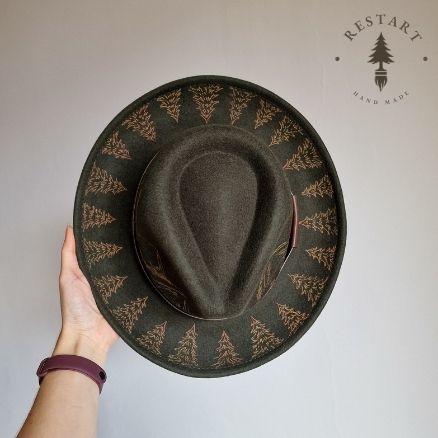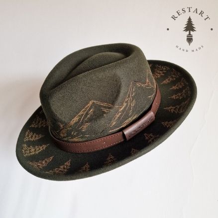 Kapelusz, który nosi w sobie opowieść o górach i lesie. Na jego koronie wypalone zostały majestatyczne szczyty, a wokół ronda rozciąga się krąg drzew.